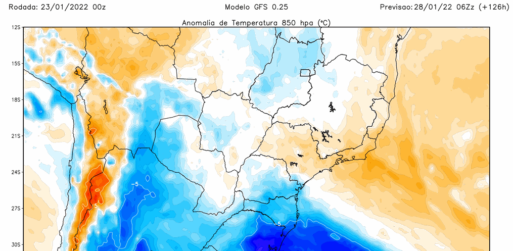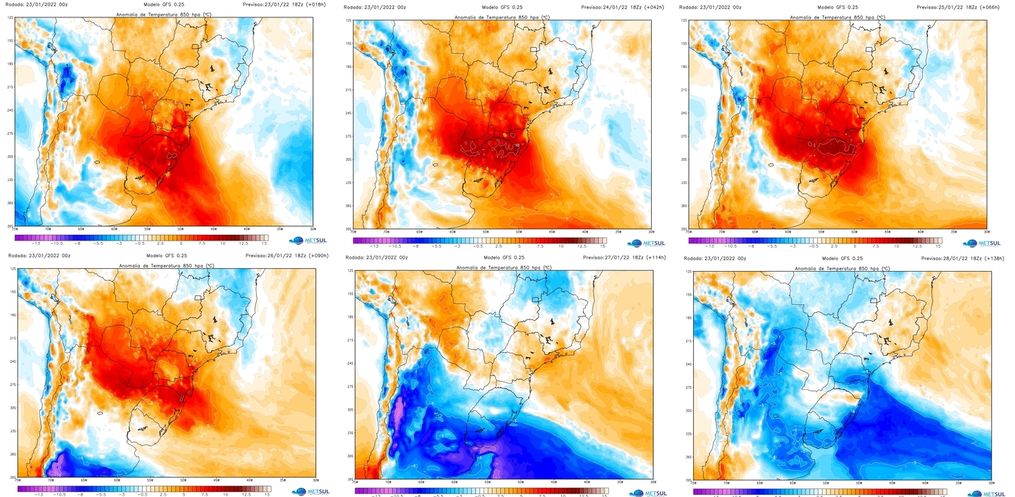 Na quarta-feira, 26, uma frente fria começa a ingressar no Rio Grande do Sul com instabilidade pelo Oeste e o Sul, mas diversas regiões gaúchas, especialmente a Metade Norte, além de Santa Catarina e o Paraná, vão estar sob uma condição pré-frontal com corrente de jato em baixos níveis da atmosfera trazendo ar quente e favorecendo intenso calor. Da tarde para a noite, chove em muitos pontos com risco de temporais. Na quinta-feira, 27, a frente fria avança pelo Rio Grande do Sul e chega aos estados catarinense e paranaense com aumento de nuvens e chuva. Ao mesmo tempo, massa de ar mais frio começa a ingressar no território gaúcho com a sua parte mais intensa sobre o Atlântico, trazendo notável queda de temperatura. É o que explica que muitas cidades devam registrar máximas ao redor ou acima de 40ºC na tarde da quarta para 24 horas depois, na quinta, terem 27ºC ou 28ºC no mesmo horário.