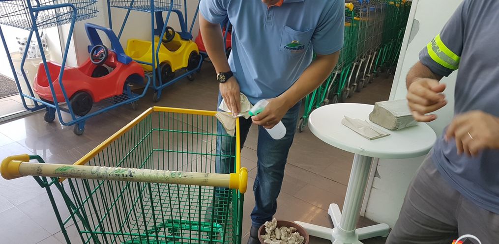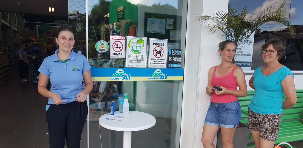 Aline diz que a entrada do estabelecimento está acontecendo com fichas para não ter aglomeração no interior do mercado. São 30 clientes por vez mais os funcionários do mercado. Aline explica que os carrinhos e cestinhas são limpos com álcool, alem de ter álcool em todos os caixas para os clientes e limpeza.