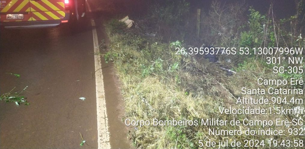Um homem de 47 anos sofreu ferimentos leves após uma saída de pista de motocicleta na noite desta sexta-feira, 5, por volta das 19h30, na SC-305, próximo à ETA da Casan, em Campo Erê.