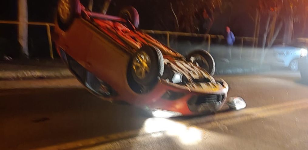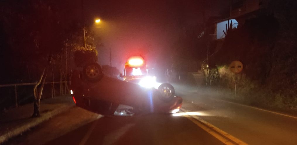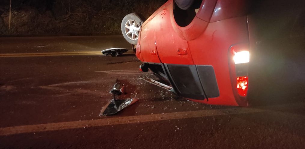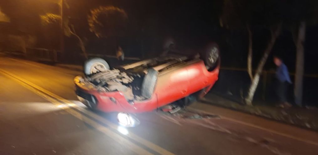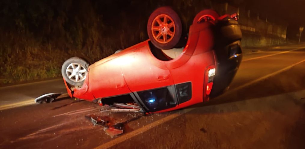 O condutor de um veículo Fiesta, com placas de Itapiranga, perdeu o controle de seu veículo, colidiu em um veículo Sandero de Itapiranga que estava estacionado e em seguida capotou.