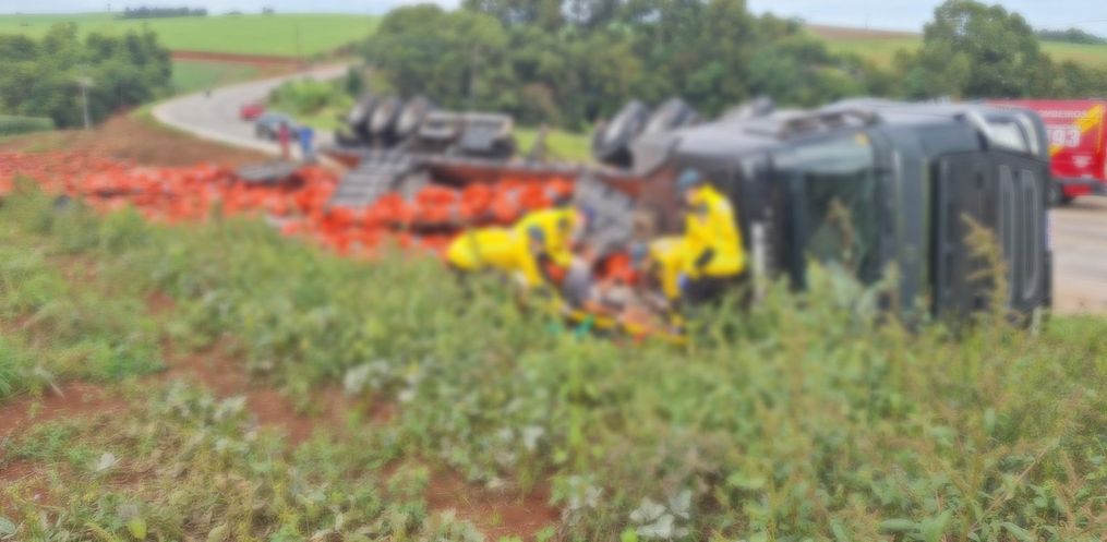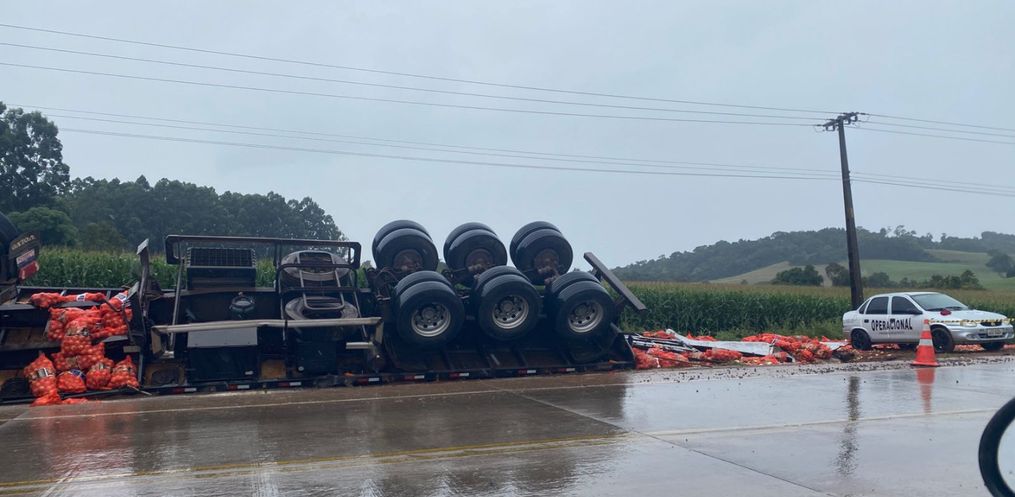 Segundo o Corpo de Bombeiros, o caminhão Volvo FH-12, seguia no sentido São José do Cedro para Guarujá do Sul quando acabou tombando às margens da rodovia. A carreta estava carregada de cebolas. O motorista, foi encontrado fora do veículo, escoriações pelo corpo e dores nos membros inferiores. O homem foi encaminhado ao hospital.