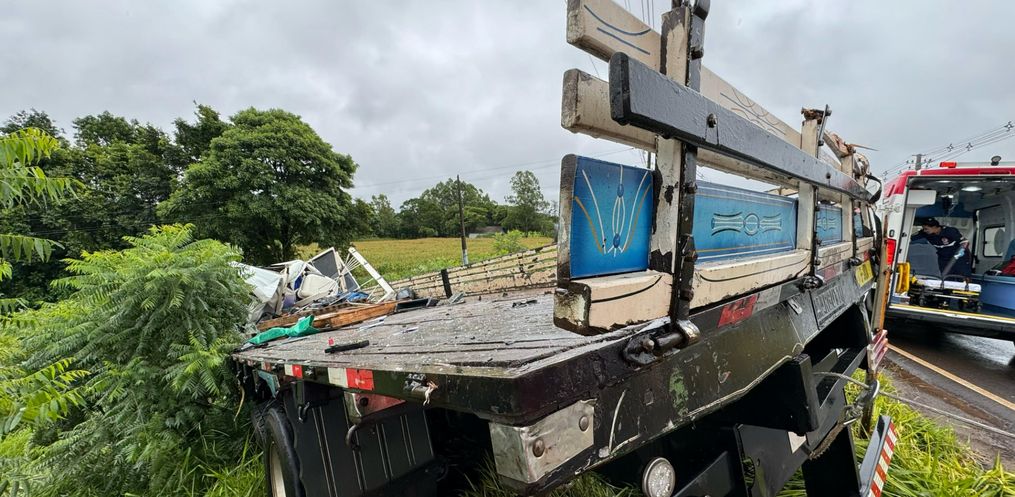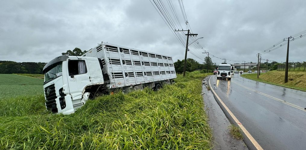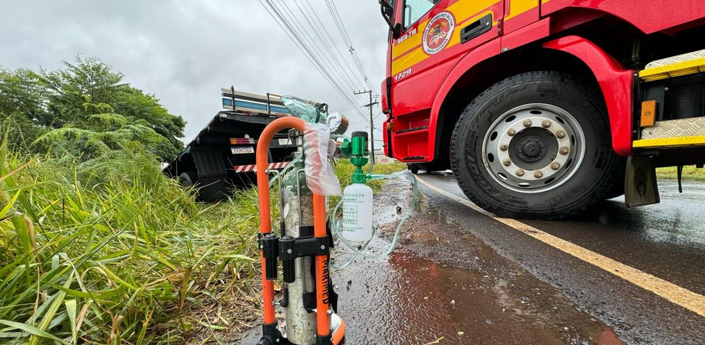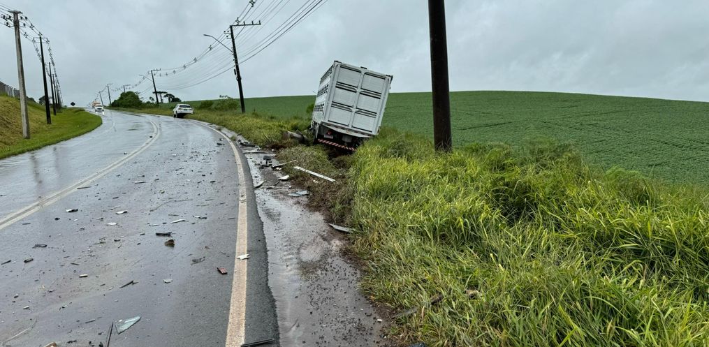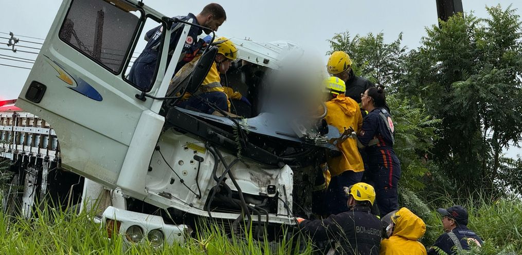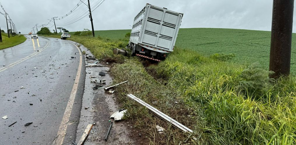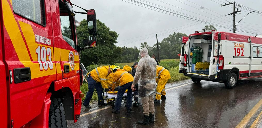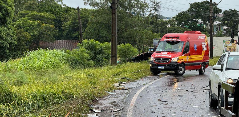 A colisão aconteceu em uma curva, nas proximidades do aeroporto Helio Wasun. Chovia na hora do acidente. O trânsito está bloqueado nos dois sentidos para o atendimento do motorista ferido e remoção dos veículos do local.