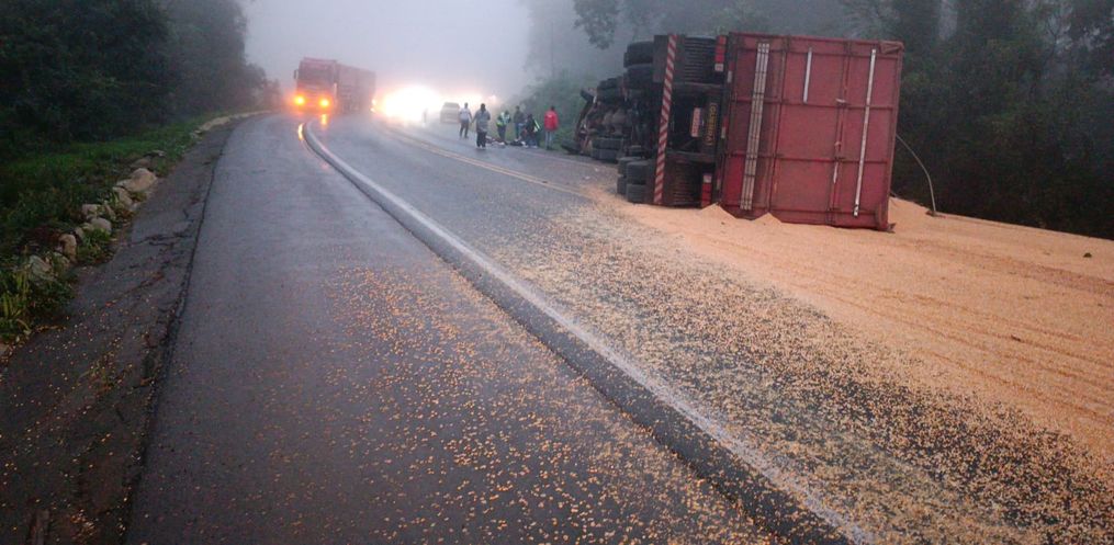 Segundo os bombeiros, o caminhão, carregado com milho, tombou sobre a pista, espalhando a carga no asfalto. O condutor, que estava consciente e orientado, sofreu um ferimento na cabeça.