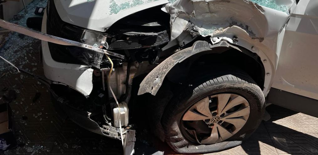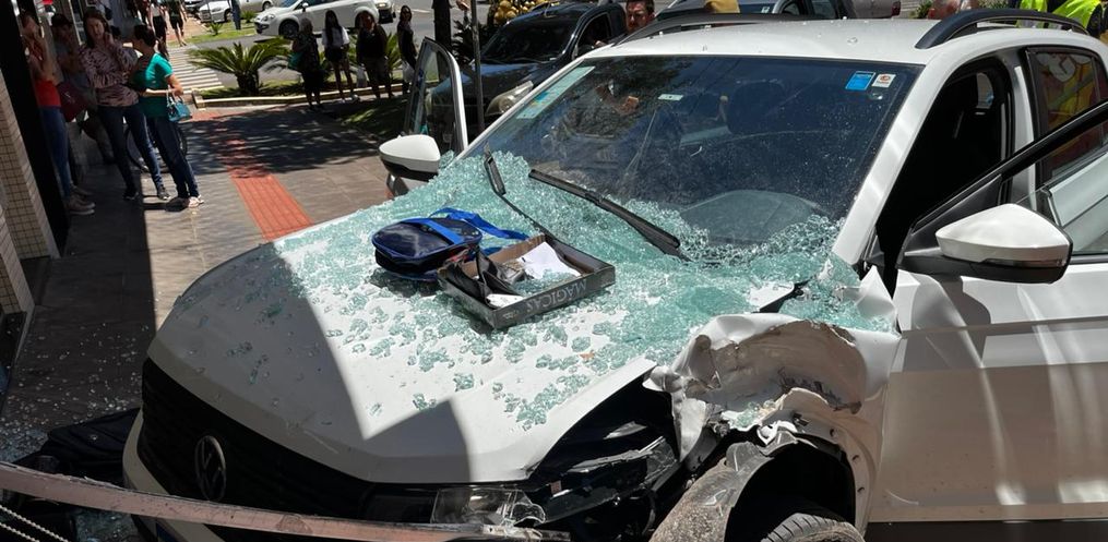 Com o impacto, a vidraça da loja quebrou e caiu sobre o carro. Dentro do comércio, prateleiras foram derrubadas e vários produtos ficaram espalhados pelo chão. O veículo, um VW T-Cross, teve danos de média monta.