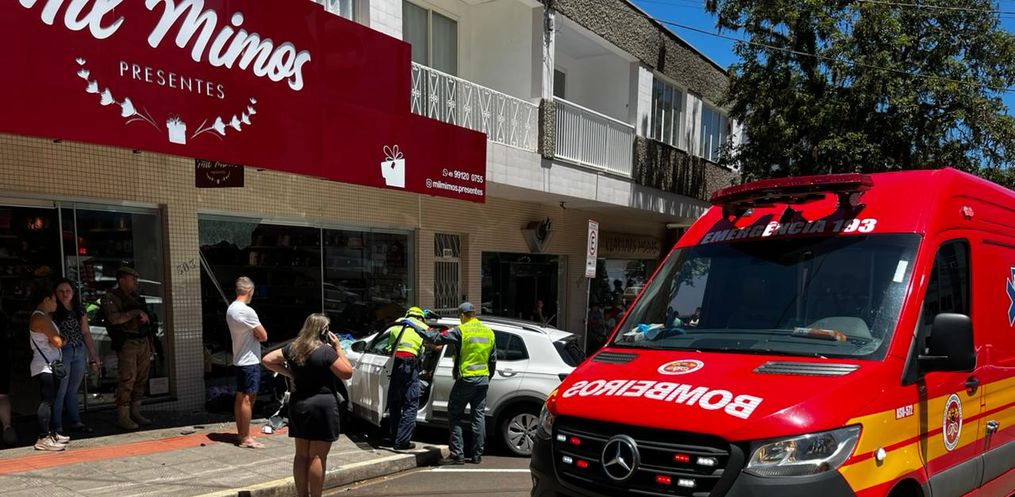 Uma mulher perdeu o controle da direção e acabou colidindo com a fachada de uma loja na manhã desta segunda-feira, 5, por volta das 11h20 na Rua Santos Dumont, no centro de São Miguel do Oeste.
