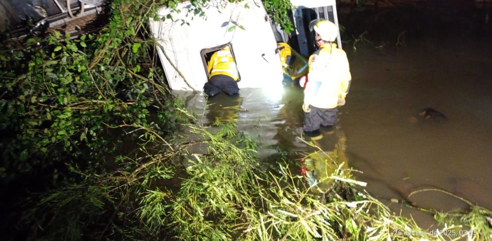 Segundo os bombeiros, o caminhão acabou saindo da pista, descendo uma ribanceira de 35 metros e parando somente dentro da água.