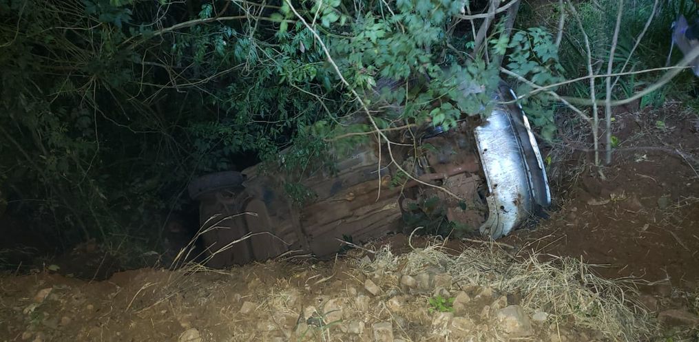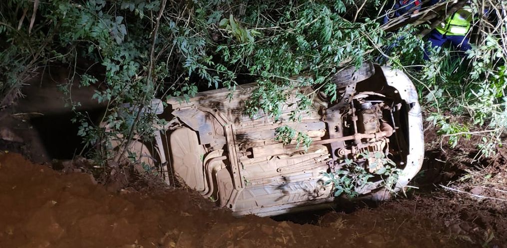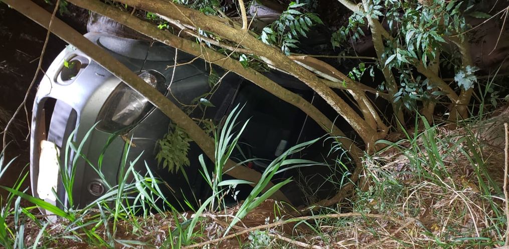 Ao chegar no local foi constatada uma ocorrência de saída de pista onde veículo ficou lateralizado depois de tombar em um córrego.