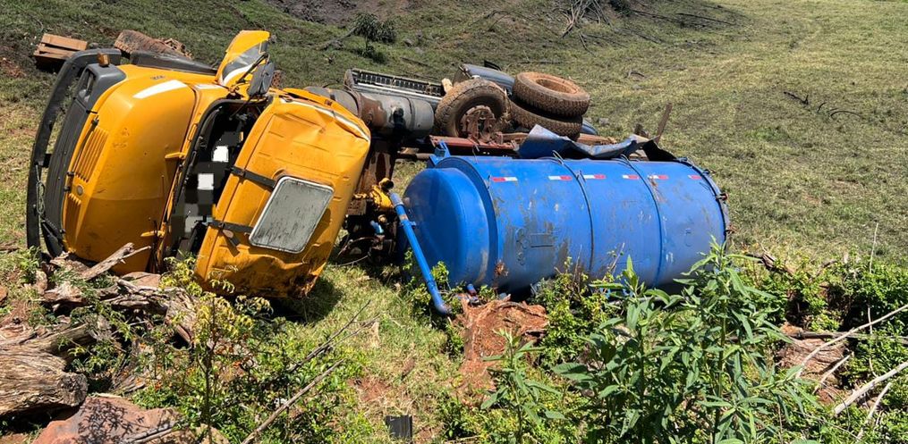 Um caminhão saiu da pista, capotou e desceu uma ribanceira em linha São José, no interior de Tunápolis, por volta das 9h30 desta sexta-feira, 5.