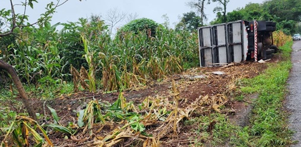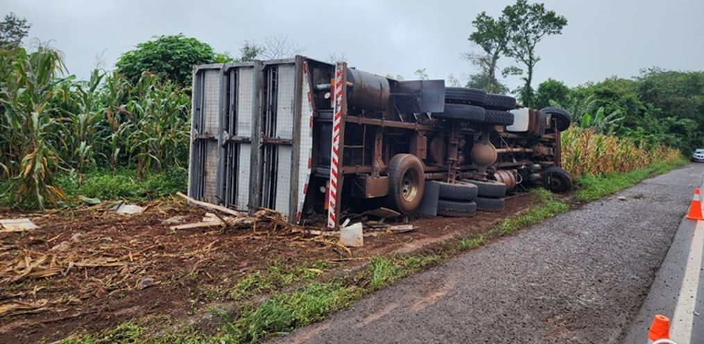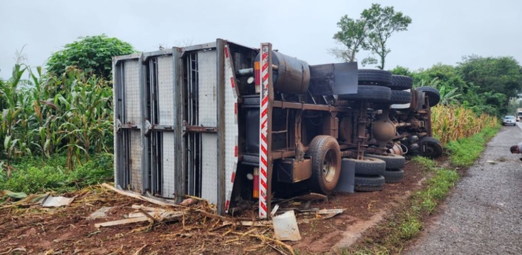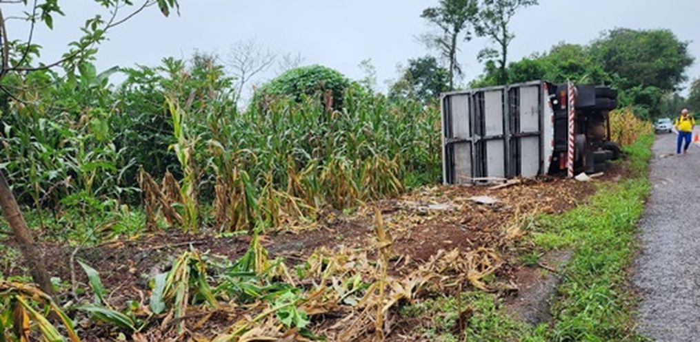 O motorista de um caminhão de transporte de suínos, um homem de 59 anos, perdeu o controle na direção, saiu da pista e tombou em uma lavoura.