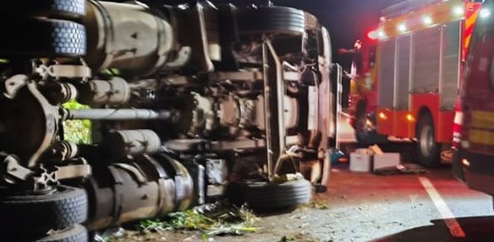 O Corpo de Bombeiros de Quilombo foi acionado por volta das 22h40 desta quarta-feira, 14, para atender uma saída de pista de um caminhão seguida de capotamento.