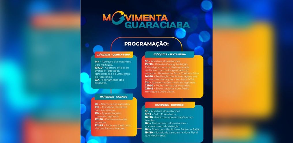Começa nesta quinta-feira, 2, a primeira edição da feira Movimenta Guaraciaba, evento que vai até domingo, 5, no espaço do CTG, reunindo 150 empresas expositoras do município. Organizada pela prefeitura, a feira tem como objetivo fortalecer o comércio local, criar oportunidades de negócios e ampliar as vendas.