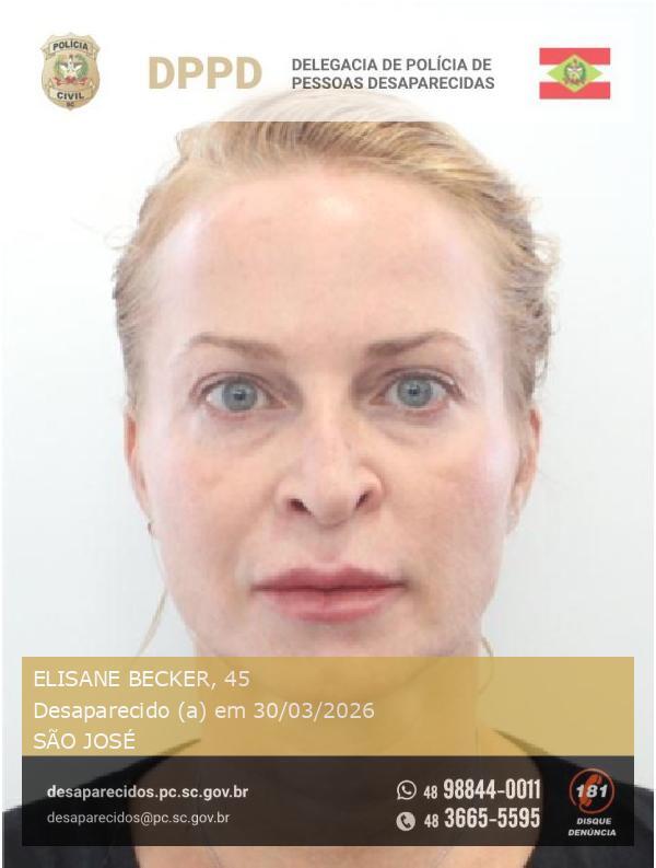 Elisiane Becker, de 45 anos, está desaparecida desde o final de março no bairro Barreiros, em São José, na grande Florianópolis. Familiares e amigos não recebem notícias desde o dia 28 de março. Ela integra o quadro de desaparecidos da Polícia Civil, que investiga o caso, desde o dia 30.