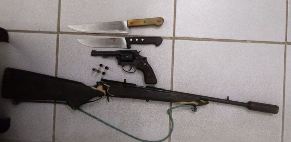 Diante disso, foi dada voz de prisão ao autor dos fatos, e apreendidos um revólver calibre .38, um rifle calibre 22 de fabricação artesanal e duas facas com marcas de sangue, possivelmente utilizadas nas vias de fato.