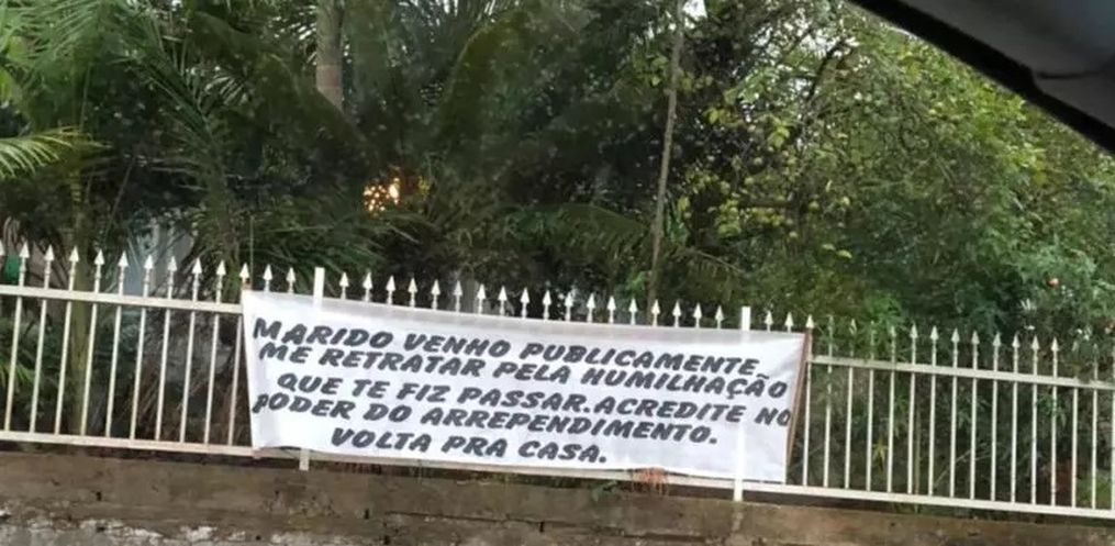 A faixa traz os dizeres “Marido venho publicamente me retratar pela humilhação que te fiz passar. Acredite no poder do arrependimento. Volta pra casa”. Não há informação de quando a faixa com o pedidos de desculpas foi estendida, mas a imagem viralizou nesta quinta-feira, 24, quando uma página de humor expôs o episódio.