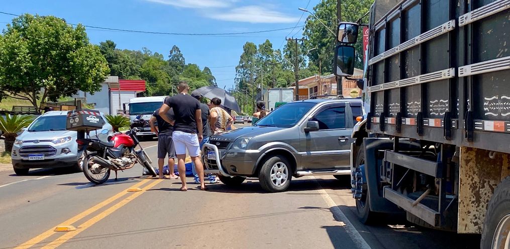 Uma mulher ficou ferida após um acidente envolvendo um carro e uma moto na manhã desta quinta-feira, 2, por volta das 11h30, na Avenida Santa Helena, no centro de Descanso. A colisão envolveu um Ford Ecosport e uma Honda CG.