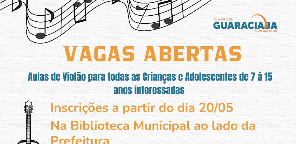 A Administração Municipal de Guaraciaba comunica que estão abertas inscrições para curso de violão, financiado pelo Fundo da Infância e Adolescência (FIA) em parceria com o Departamento de Cultura. A Atividade é proposta pelo CMDCA – Conselho Municipal dos Direitos da Criança e do Adolescente de Guaraciaba.