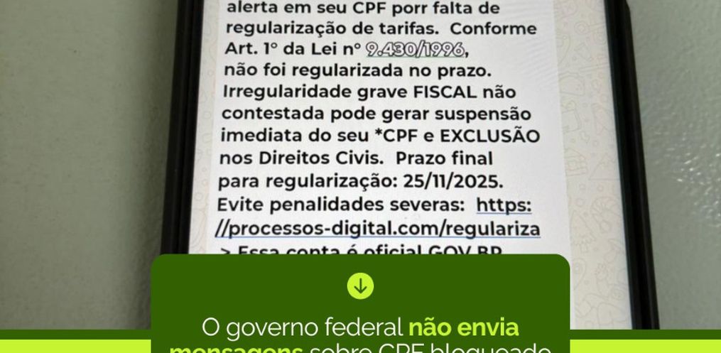 A prefeitura citou que os criminosos usam o nome e o logotipo do GOV.BR para enviar mensagens falsas sobre suposta “irregularidade fiscal grave”, tentando fazer com que as vítimas cliquem em links fraudulentos. O alerta explica ainda que os golpistas enviam avisos com tom de urgência, citando leis e ameaçando suspender o CPF da vítima.