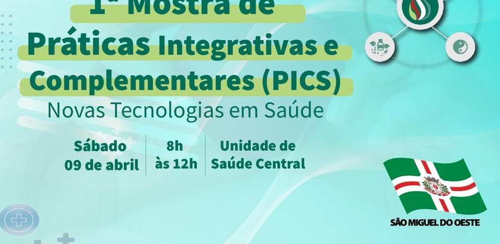 A Secretaria de Saúde de São Miguel do Oeste realizará no próximo sábado, 09, a 1ª Mostra de Práticas Integrativas e Complementares em Saúde (PICS). O evento, voltado a toda população, é alusivo ao Dia Mundial da Saúde, e será desenvolvido das 8h às 12h, na Unidade de Saúde Central, ao lado da Praça Belarmino Annoni.