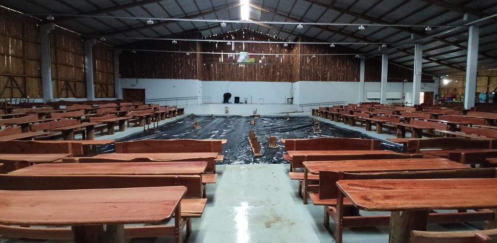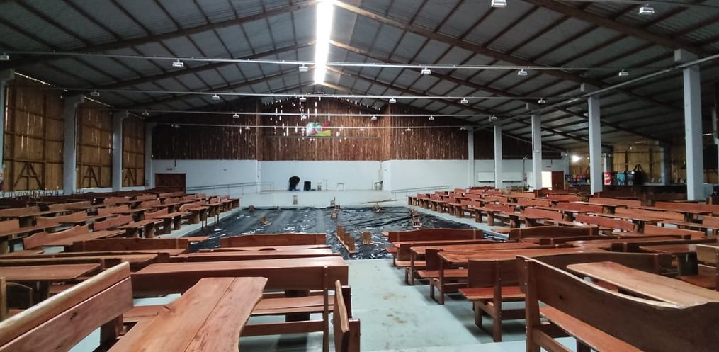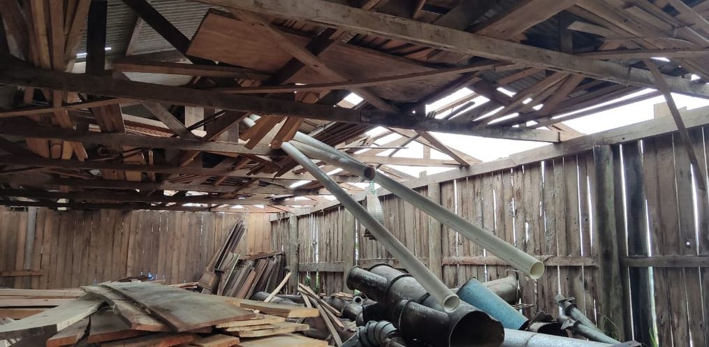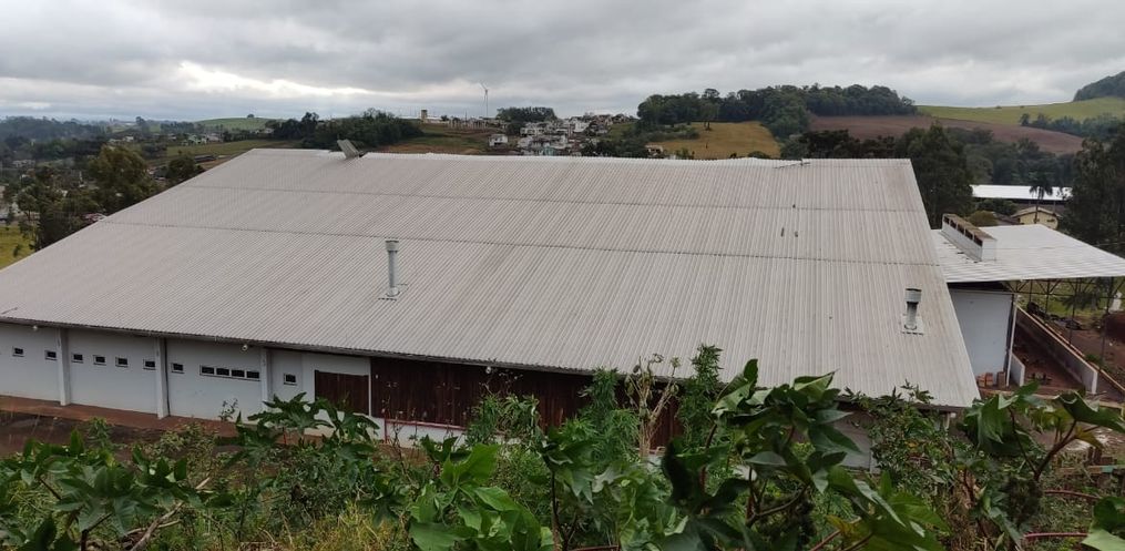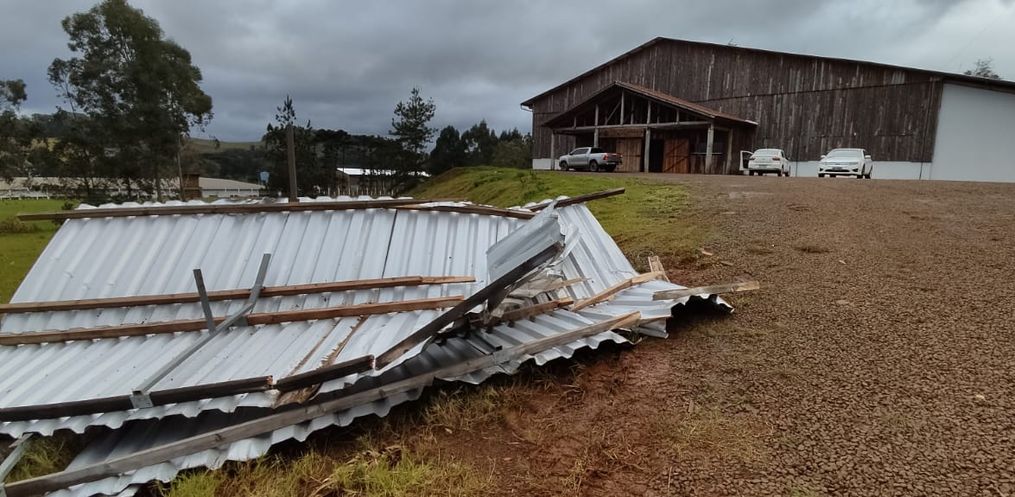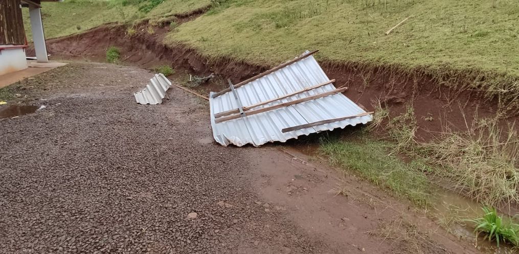 A Sede do CTG Mate Amargo teve uma parte do telhado danificada com os fortes ventos registrados, arrancando a cobertura central do telhado.