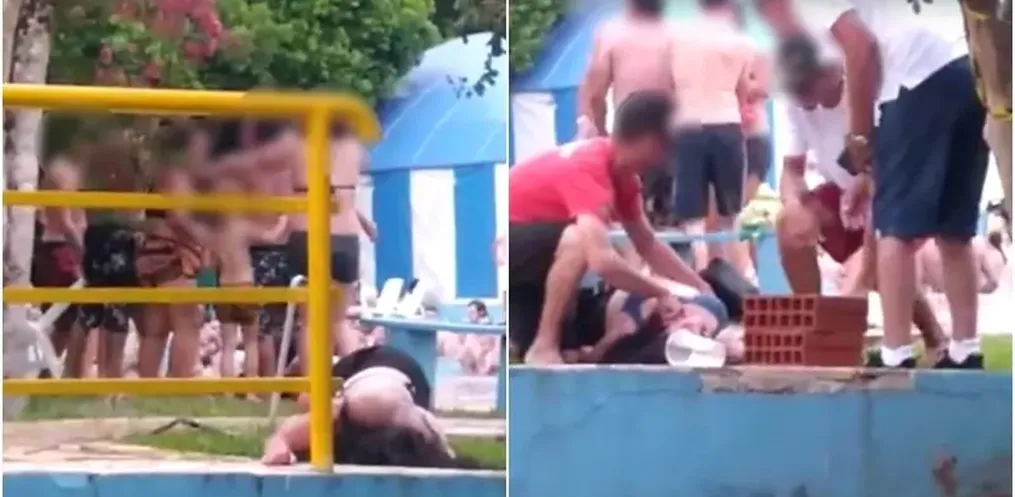 Imagens compartilhadas na internet mostram a confusão generalizada ao lado das piscinas. A mulher aparece de biquíni caída desacordada no chão e sendo amparada por socorridas do local. Enquanto isso, alguns homens trocam socos e chutes.