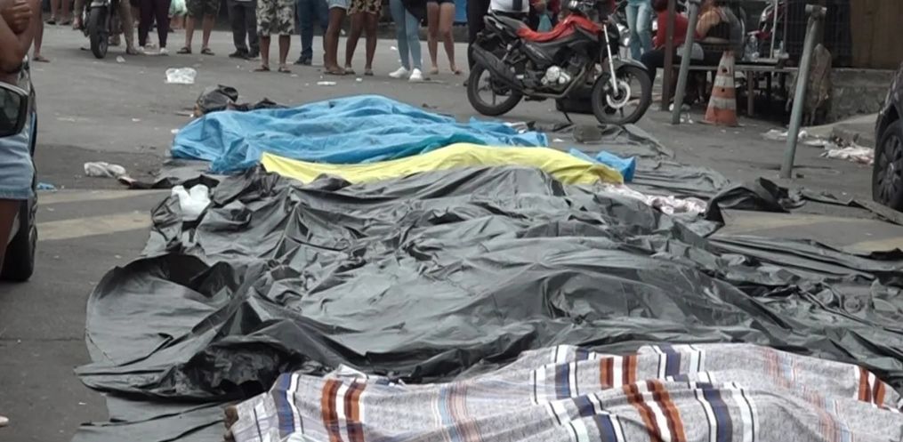 A Praça da Penha, na zona Norte do Rio, amanheceu com uma fila de corpos estendidos em uma lona na manhã desta quarta.