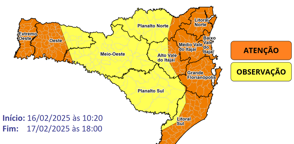 Os termômetros ultrapassam os 32°C em todas as regiões do estado. No Oeste, as máximas ficam entre 35°C e 37°C. Já no Litoral e no Vale do Itajaí, o calor será ainda mais intenso, podendo atingir 39°C no Litoral Norte e no Litoral Sul.