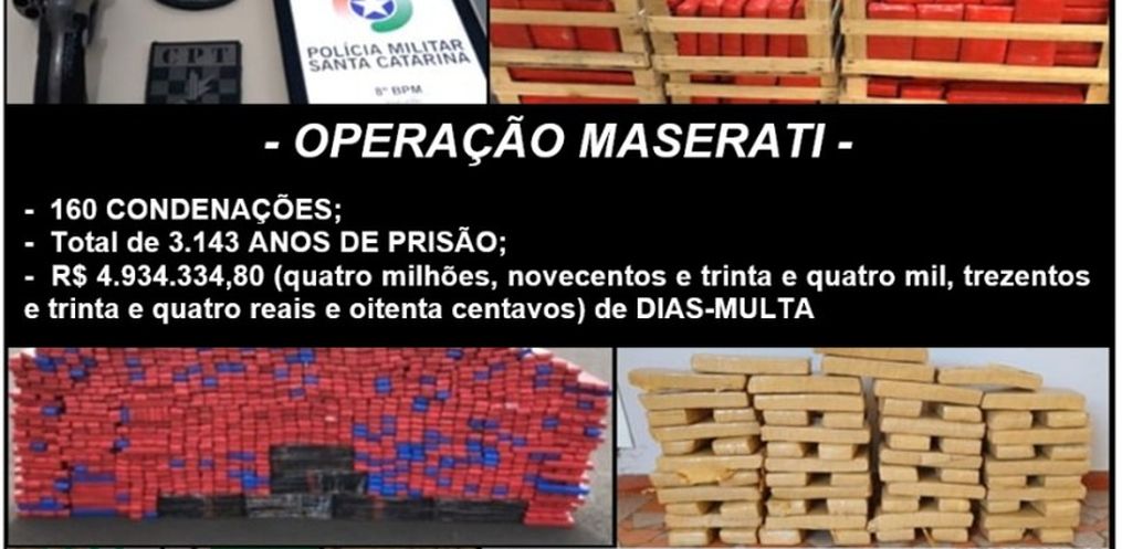 O Ministério Público de Santa Catarina (MPSC), através da 2ª Promotoria de Justiça de São Miguel do Oeste, obteve a condenação de 141 criminosos identificados e investigados durante a Operação Maserati. A operação gerou ao todo 160 condenações. Dos denunciados, 75 foram condenados a penas superiores aos 20 anos de prisão; e a pena máxima foi de 86 anos. Além da prisão, os réus foram condenados ao pagamento de multas que somam mais de R$ 4,8 milhões.