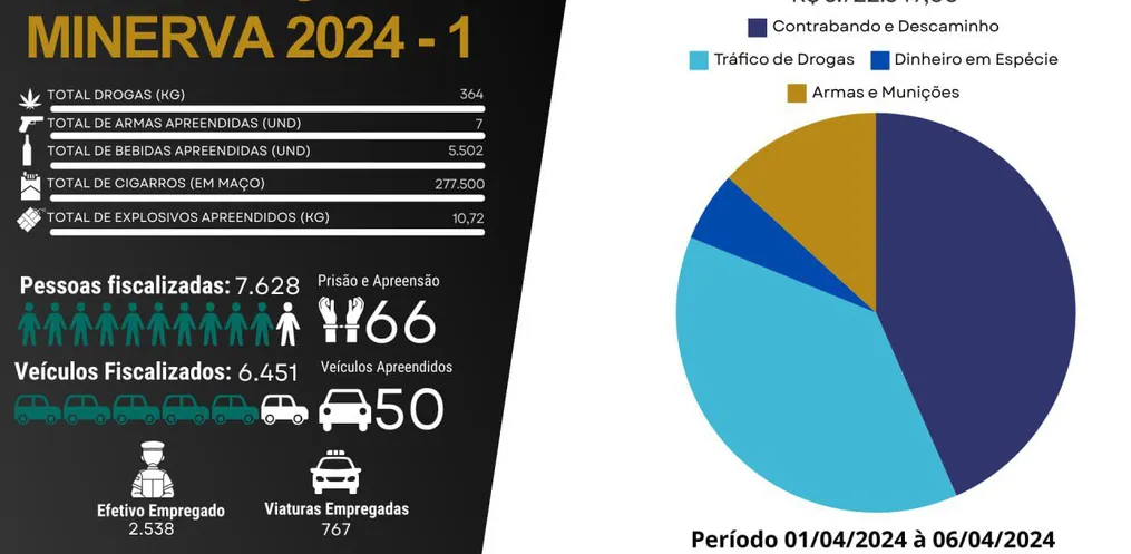 A primeira edição da Operação Minerva de 2024 terminou no saldo com números expressivos e um prejuízo considerável para o crime na região de fronteira. A ação foi organizada pelo 9° Comando Regional de Polícia Militar de Fronteira e teve como foco principal a segurança e proteção do comércio e dos moradores da região. A iniciativa ocorreu entre os dias 1º e 6 de abril e fez parte também da Operação Fronteiras e Divisas Seguras com resultados gerais de mais de 10,5 mil policiais militares empregados nas ações em 2,7 mil viaturas, abordando mais de 49,5 mil pessoas.