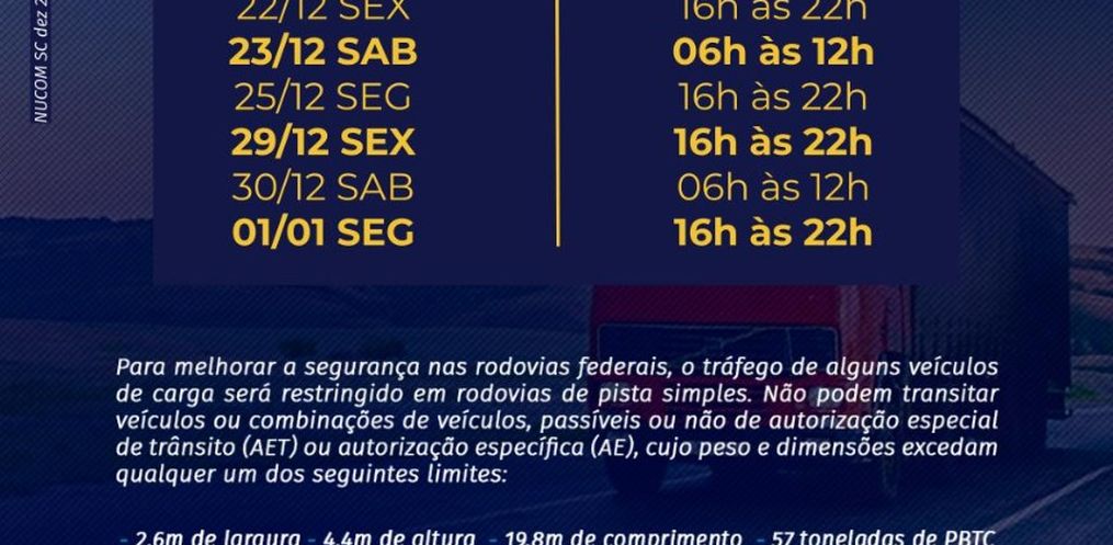 Haverá também a restrição de tráfego em pista simples para veículos de cargas excedentes, ou seja, que ultrapassam as dimensões máximas permitidas e que precisam de AET (Autorização Especial de Trânsito), nos trechos de pista simples das BRs 116, 280, 282 e 470. A ação tem o objetivo de aumentar a fluidez do trânsito e ocorrerá nos seguintes dias e horários: