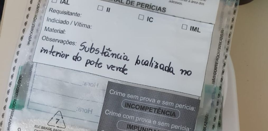 Nos locais, os cães farejadores indicaram dois copos com pó branco que posteriormente foi confirmado quimicamente ser cocaína. O material apreendido foi encaminhado para o Instituto Geral de Períciais realizar os laudos definitivos.