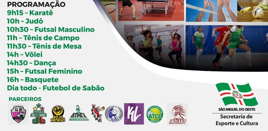 A programação começa às 09h15 com a modalidade de Karatê. Depois também serão contempladas as modalidades de judô, futsal masculino, tênis de campo, tênis de mesa, vôlei, dança, futsal feminino, basquete e futebol de sabão.