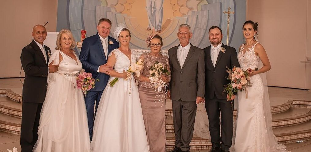 Os aposentados Jacir e Dirlei Ana Gitrone, de 71 e 67 anos, tinham o sonho de celebrar 50 anos de união e o casamento religioso dos três filhos, que já eram casados no civil, ao mesmo tempo.