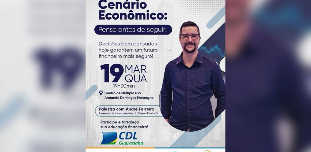 A Câmara de Dirigentes Lojistas (CDL) de Guaraciaba e a Secretaria de Indústria e Comércio promovem, no próximo quarta-feira, 19, uma palestra sobre o cenário econômico atual. Com o tema "Pense antes de seguir: seu futuro financeiro agradece por refletir", o evento acontece às 19h30, no Centro de Múltiplo Uso Armando Domingos Montagna.