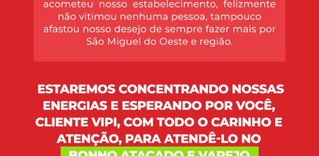 Crestani lembrou que em 2012 um incêndio destruiu o depósito que nesta vez ficou intacto. Segundo o empresário, o Super Vipi está em São Miguel do Oeste há quase 40 anos e a empresa possui seguro.