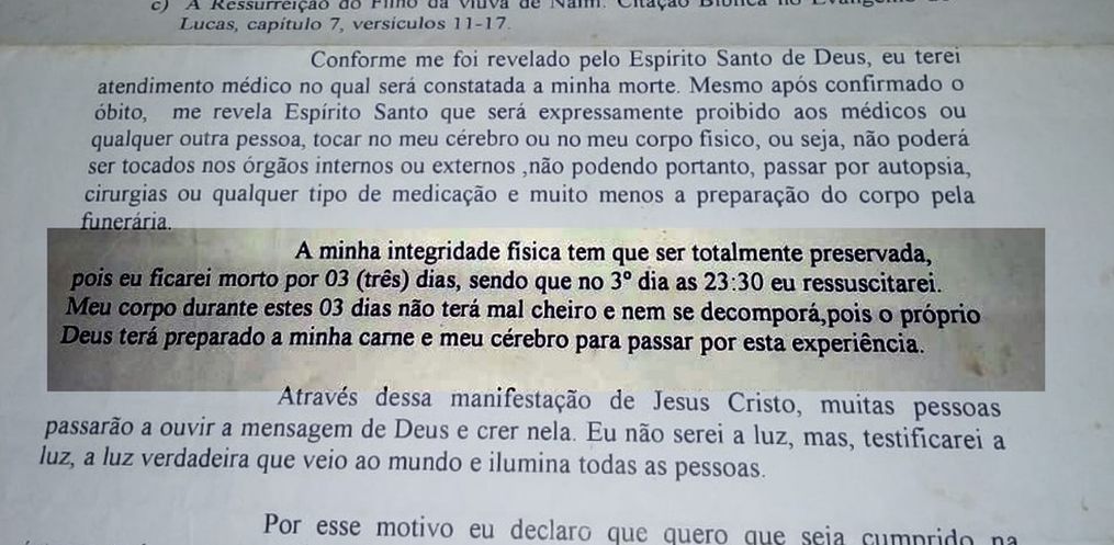A carta foi redigida por ele em 2008, afirmando que teve divinas revelações do Espirito Santo e que passaria por um “mistério de Deus”, ressuscitando às 23h30 do terceiro dia após sua morte. “Minha integridade física tem que ser totalmente preservada, pois ficarei por três dias morto, sendo que no 3ª dia, eu ressuscitarei. Meu corpo durante os três dias não terá mau cheiro e nem se decomporá, pois o próprio Deus terá preparado minha carne e meu cérebro para passar por essa experiência”, escreveu o pastor no documento. A declaração não foi registrada em cartório, mas foi assinada por duas testemunhas.