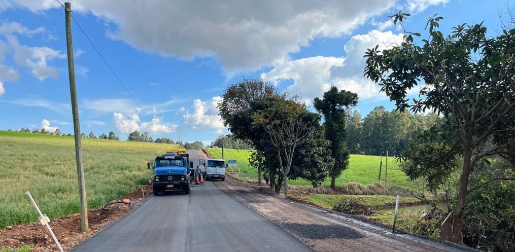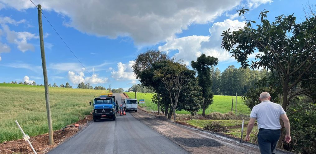 A pavimentação na comunidade de Linha São Roque, interior de Guaraciaba, está em fase final. Segundo a prefeitura, a empresa responsável já concluiu as etapas de limpeza, drenagem e preparação da base, e agora trabalha na aplicação da camada asfáltica.