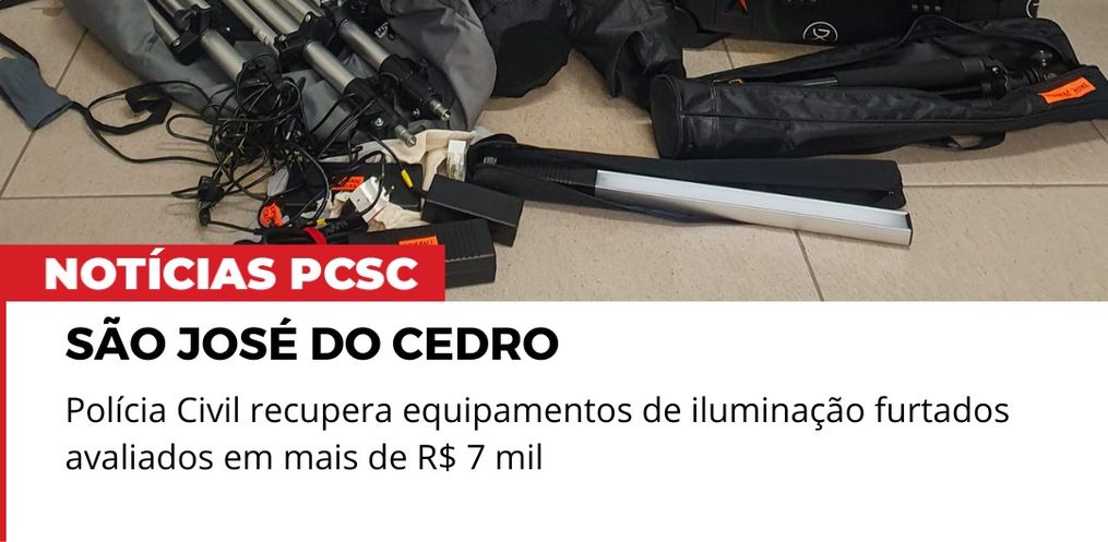 A Polícia Civil de São José do Cedro, recuperou equipamentos de iluminação profissional furtados na madrugada do último sábado, 18. O crime aconteceu em frente a uma casa de eventos no centro da cidade, onde a vítima, um fotógrafo, cobria uma festa de aniversário.