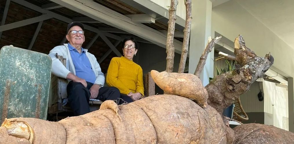O produtor Otávio Hoeppner conta que precisou de ajuda para colher o pé de mandioca de 112 quilos que se desenvolveu no terreno que tem com a esposa, Wilma, em Pomerode, no Vale do Itajaí, em Santa Catarina. Ele e o jardineiro da propriedade vizinha levaram quatro horas para retirar toda a planta da terra, contou.