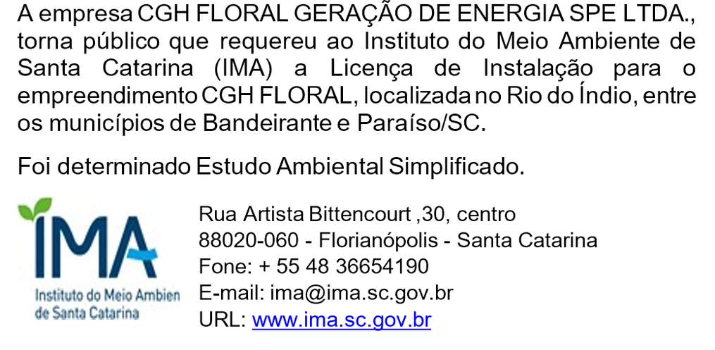 A empresa CGH FLORAL GERAÇÃO DE ENERGIA SPE LTDA., torna público que requereu ao Instituto do Meio Ambiente de Santa Catarina (IMA) a Licença de Instalação para o empreendimento CGH FLORAL, localizada no Rio do Indio, entre os municípios de Bandeirante e Paraíso/SC.