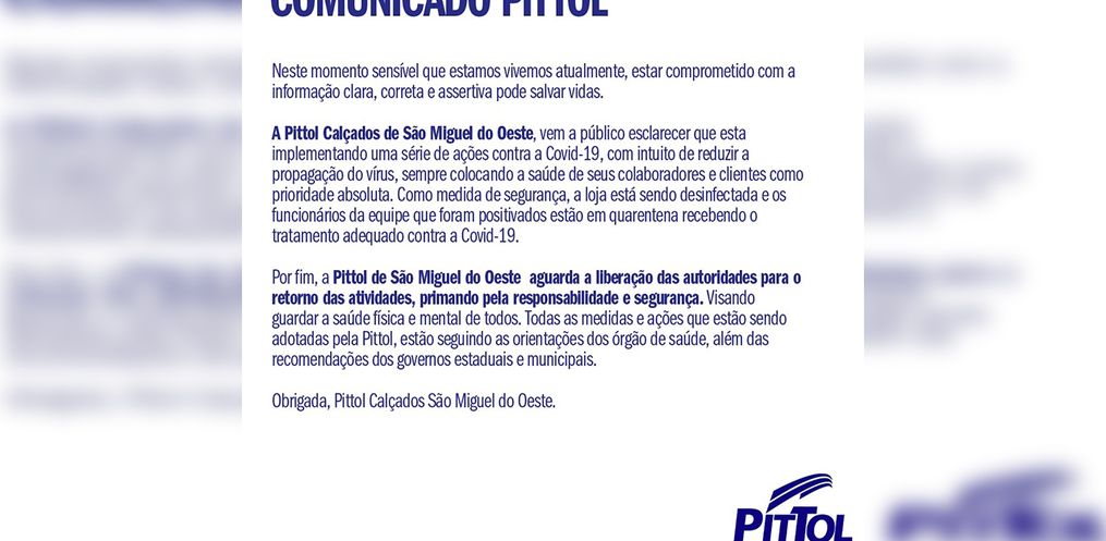 A Pittol Calçados de São Miguel do Oeste, vem a público esclarecer que está implementando uma série de ações contra a Covid-19, com intuito de reduzir a propagação do vírus, sempre colocando a saúde de seus colaboradores e clientes como prioridade absoluta. Como medida de segurança, a loja está sendo desinfectada e os funcionários da equipe que foram positivados estão em quarentena recebendo o tratamento adequado contra a Covid-19.
