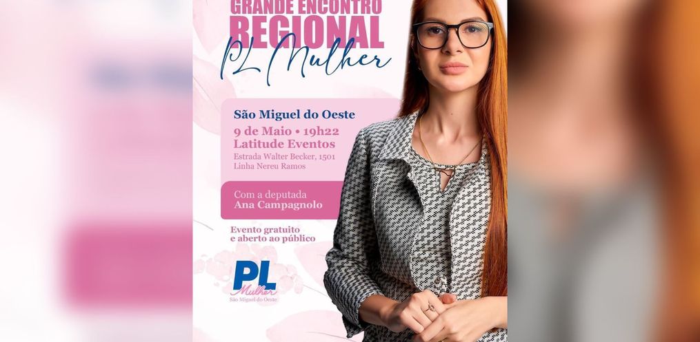O PL Mulher de São Miguel do Oeste promove nesta sexta-feira, 10, um encontro regional para incentivar a participação das mulheres na política e fortalecer o partido na região. O evento está marcado para as 19h22, no espaço Latitude Eventos.