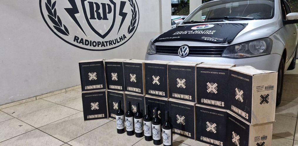 Um carro carregado com 90 garrafas de vinho foi apreendido pela Polícia Militar na madrugada desta sexta-feira, 20, por volta das 0h15, na BR-282, em Maravilha.