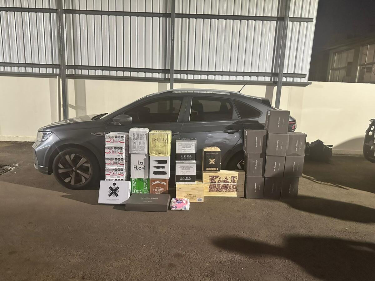 No carro, foram encontradas mais de 130 garrafas de vinho estrangeiro, também sem documentação e acima da cota permitida. Os ocupantes, moradores de Lages, relataram que haviam ido até a Argentina para comprar os produtos.
