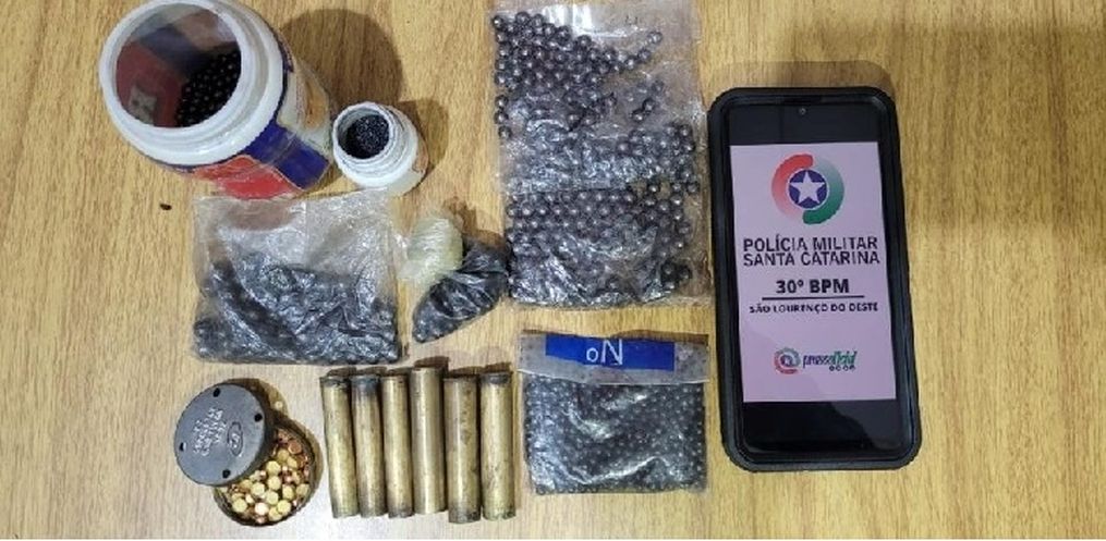 A Polícia Militar apreendeu, na madrugada de sábado (27), em uma boate às margens da rodovia SC-305, na linha Bela Vista, em São Lourenço do Oeste (SC), insumos de recarga para munição de espingarda que estavam acondicionados dentro de um balde no bagageiro de um veículo HB20. Havia 85 espoletas, um frasco contendo pólvora, três cartuchos calibre 32 deflagrados, três cartuchos calibre 36 deflagrados e 1,6 quilo de projéteis tipo chumbo.