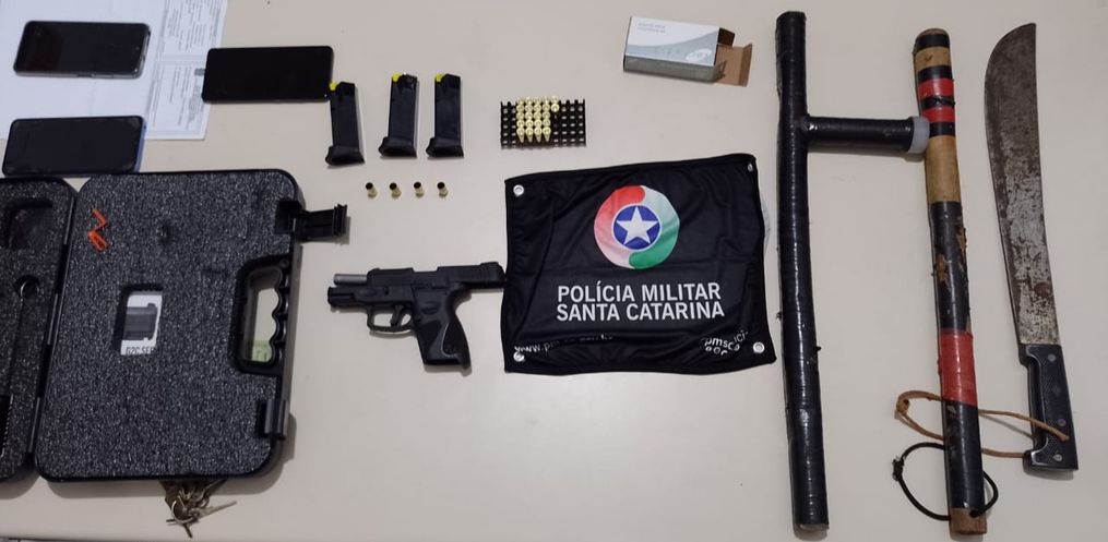 Já no veículo foram encontradas quatro munições de calibre 9mm deflagradas, além de um facão, uma tonfa e outro pedaço de madeira.