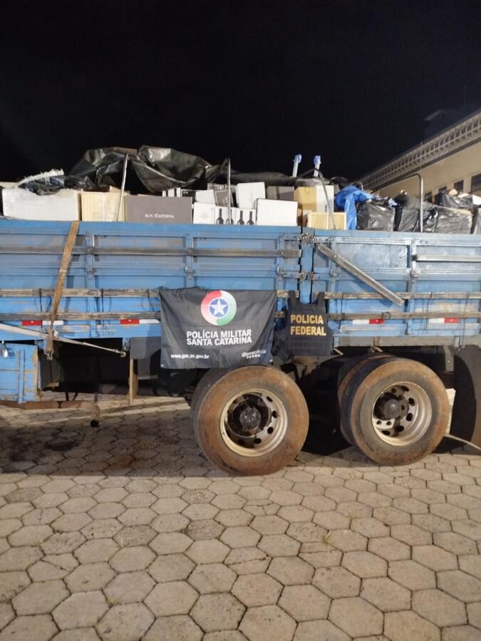 Uma ação conjunta da Polícia Militar e da Polícia Federal resultou na apreensão de uma grande carga de mercadorias ilegais na noite de sexta-feira, 10, por volta das 20h, na estrada geral de acesso ao bairro Aeroporto, em Dionísio Cerqueira.