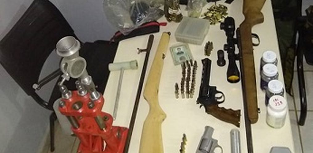 Ainda foram localizados dois coletes balísticos, máquina de recarga de munições, diversos estojos, pólvora e projéteis utilizados para recarga, uma coronha de Espingarda feita artesanalmente e um cano de espingarda, também artesanal.