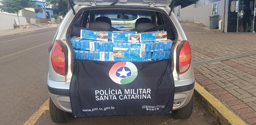 Durante a vistoria no interior do veículo, os policiais localizaram cerca de 11 caixas de cigarros de origem estrangeira, totalizando 550 pacotes, o que caracteriza, em tese, o crime de contrabando. De acordo com relato dos envolvidos, a carga teria saído de Dionísio Cerqueira com destino a Campo Erê, onde seria entregue.