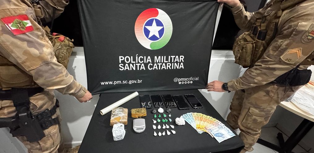 O cão farejador encontrou cerca de 590g de maconha, 33g de crack, 32g de cocaína, balança de precisão, R$ 650 em dinheiro, celulares, embalagens e um caderno com anotações típicas do tráfico. O suspeito foi preso em flagrante e encaminhado à Delegacia de São Miguel do Oeste, junto com os materiais apreendidos e uma testemunha.