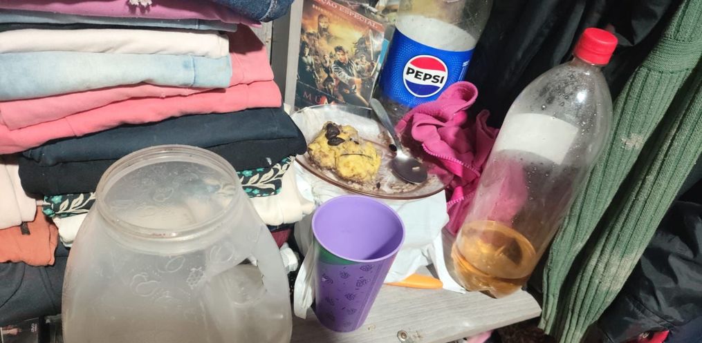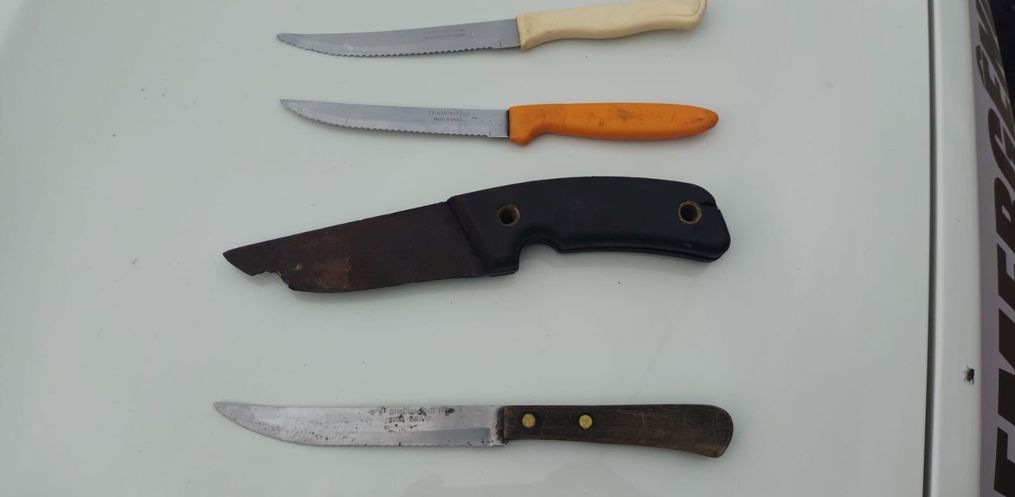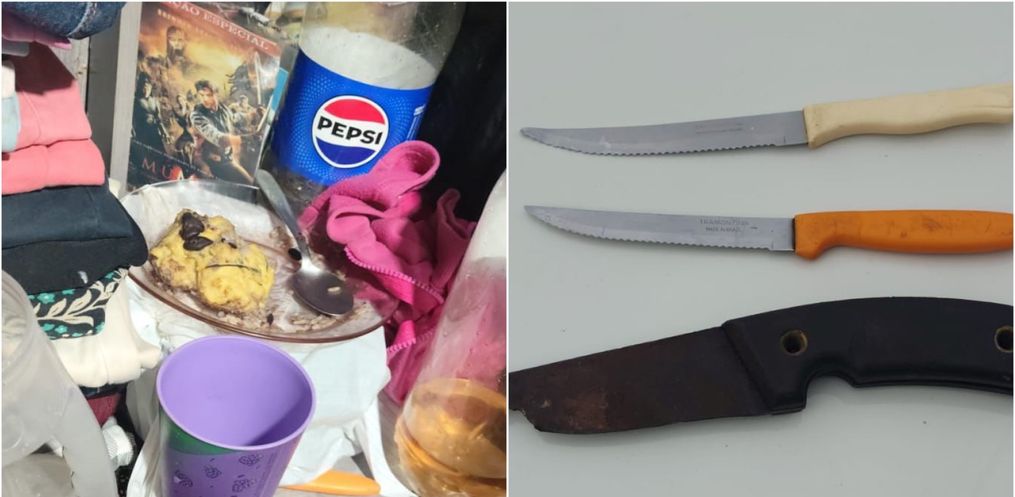 No quarto onde o casal estava os policiais localizaram quatro facas. A guarnição também constatou que a vítima se alimentava somente dentro do quarto.
